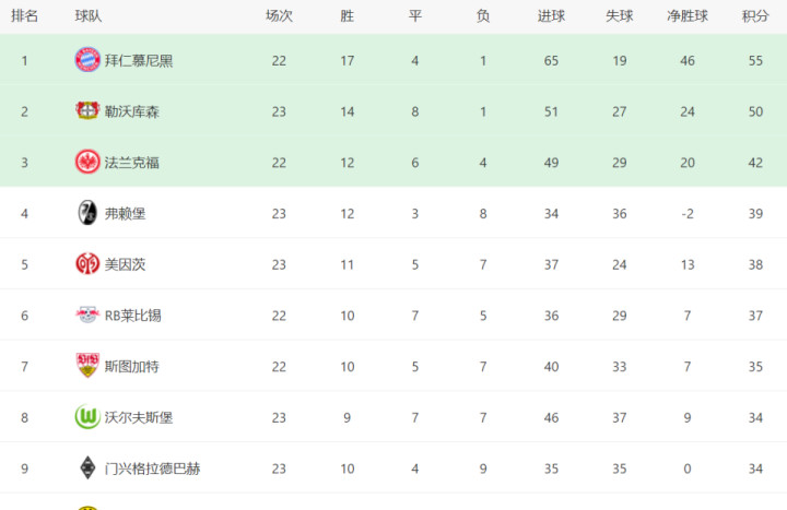 拜仁以55分继续领跑积分榜,勒沃库森以50分紧随其后,但多赛一场。法兰克福、弗赖堡和美因茨分别位列第三至第五位。多特蒙德虽然本轮大胜,但仅积32分,排名第十,争夺欧冠资格的路途依然艰难。